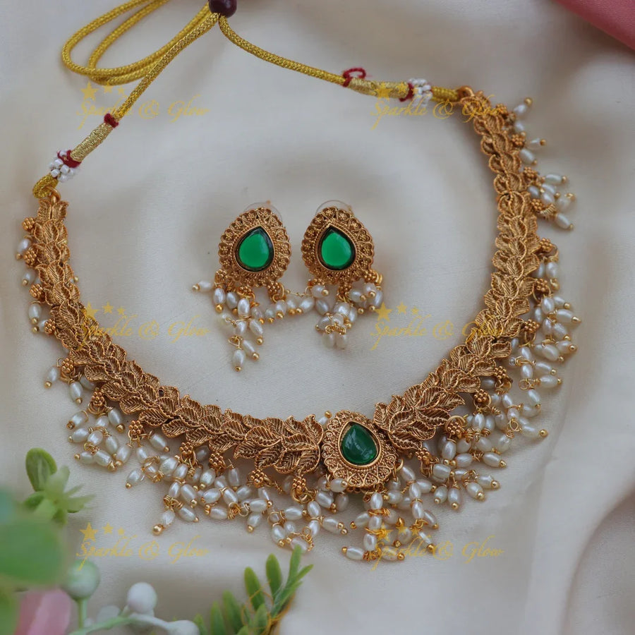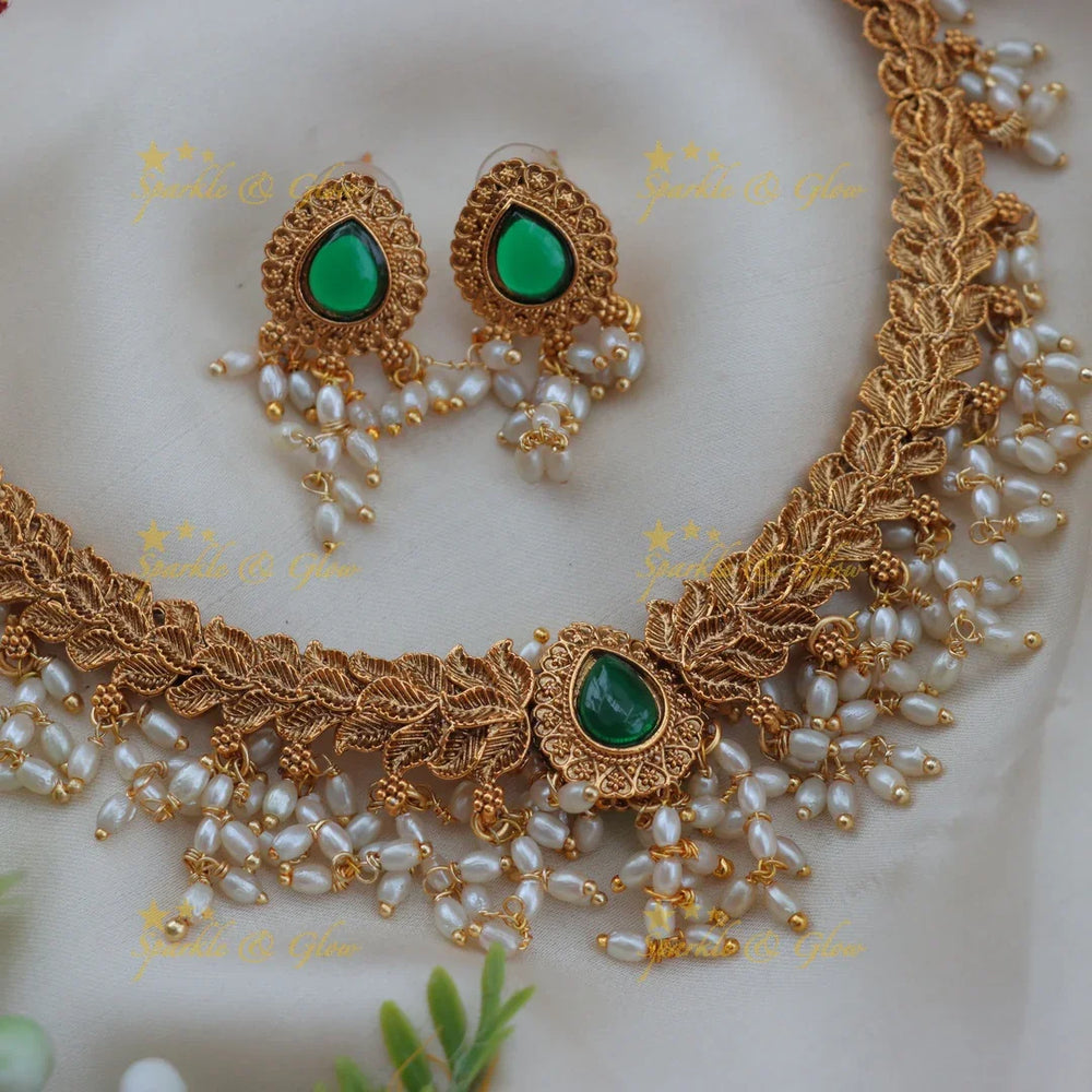 At first glance, the necklace mesmerizes with its lush leaf motif base, meticulously detailed in a textured matte gold finish. Each leaf is individually crafted, forming a delicate vine pattern that embraces your neckline with grace. The highlight of the set lies in the centrepiece — a beautifully carved pendant adorned with a rich, green teardrop stone, which instantly adds depth and vibrance to the design. Complementing this centerpiece is a generous arrangement of pearl-like beads, strung with care to create the signature Guttapusalu effect — a cascading flow of beads that sway elegantly with your every movement.