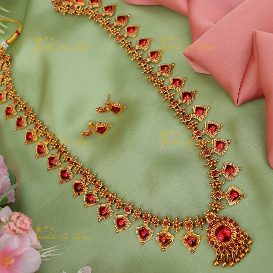 Discover the opulence of traditional Indian craftsmanship with our exquisite Kemp Bridal Necklace, an embodiment of elegance and cultural heritage. This magnificent piece is meticulously handcrafted, featuring intricate designs inspired by the rich traditions of Kerala jewelry making. The vibrant red stones, set in a lustrous gold finish, give this necklace a regal aura, making it perfect for weddings, festivities, and grand celebrations.