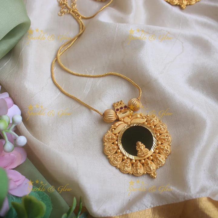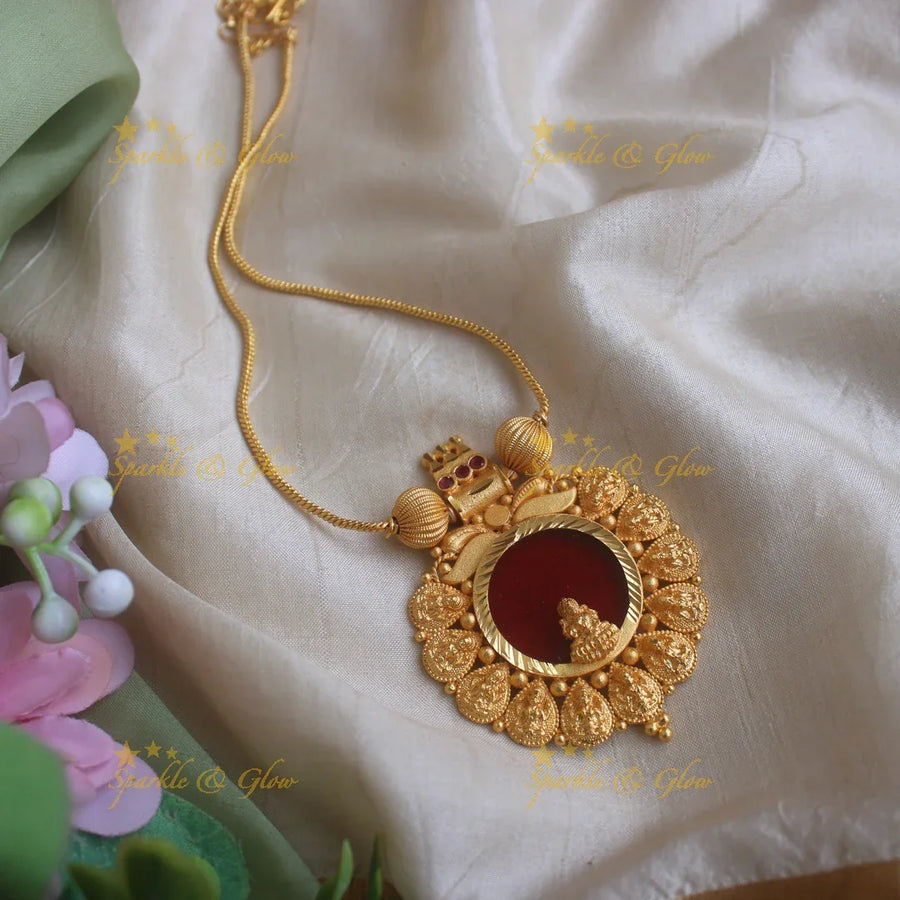 Experience the opulence of tradition with our Kerala Style Lakshmi Coin Pendant Necklace - Red. This exquisite piece captures the essence of South Indian heritage, featuring the revered Goddess Lakshmi motif surrounded by intricate coin designs. The radiant red center adds a touch of festivity, perfectly complementing the lustrous gold finish. Ideal for weddings and festive occasions, this necklace is a testament to timeless elegance and divine beauty.