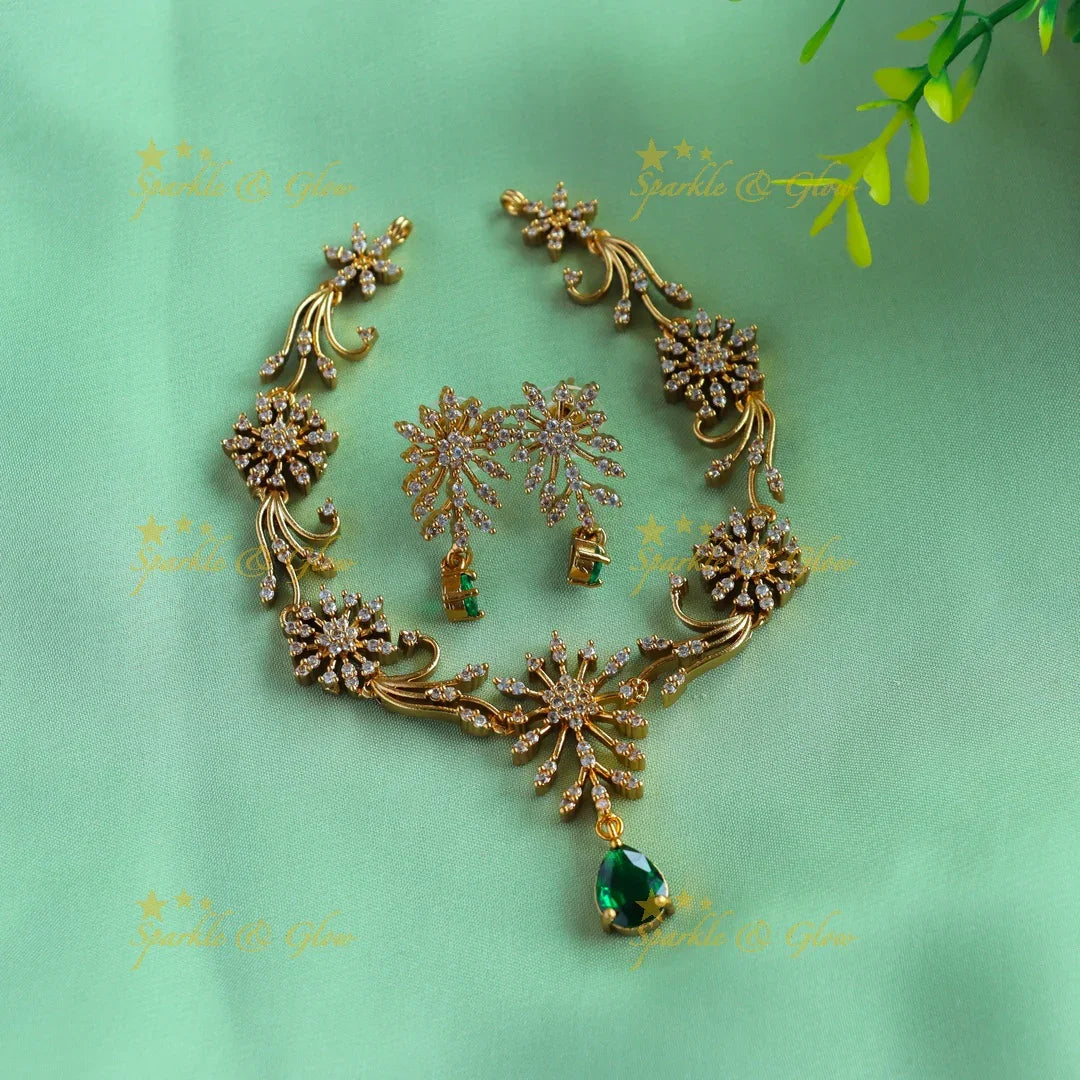 Embrace elegance with the Star Floral Leaflet AD Necklace in a captivating light pink hue. This exquisite piece features intricate floral motifs adorned with radiant American diamonds, set against a luxurious gold finish. Each petal and leaflet is meticulously crafted to create a harmonious blend of tradition and modernity, perfect for festive occasions and weddings.