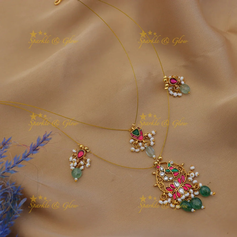 Introducing our Statement Jadau Kundan Peacock Lotus Floral Invisible Necklace — a masterpiece of festive elegance crafted for the modern bride and heritage lover alike. This exquisite jewellery set captures the spirit of traditional Indian artistry through its meticulous detailing and vibrant color palette, making it a perfect pick for weddings, festive occasions, and cultural celebrations.