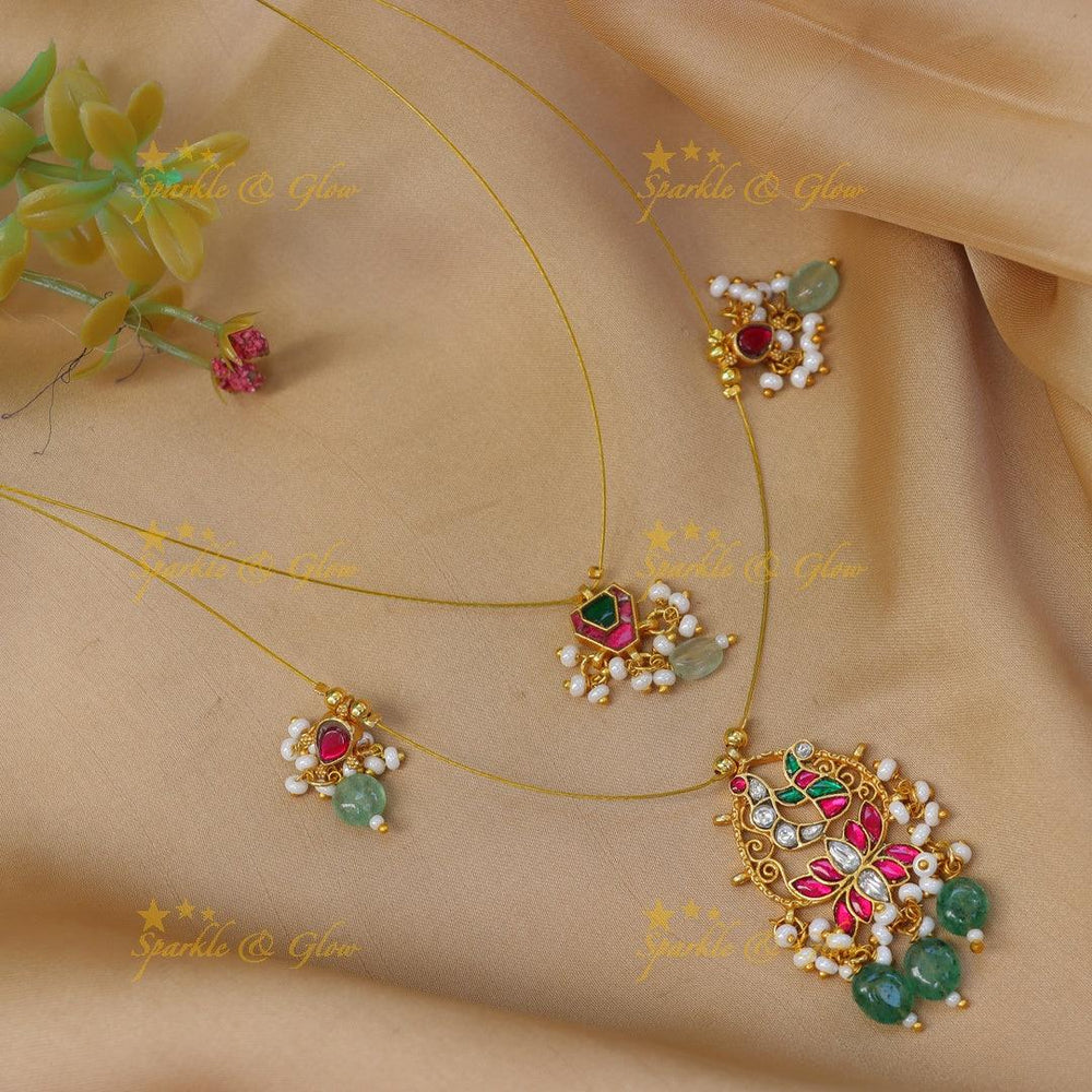 The pendant is flanked by intricately layered pearls and emerald-toned glass beads, which add movement and traditional charm to the piece. The combination of floral and bird-inspired motifs offers a timeless aesthetic, while the invisible setting elevates the elegance to suit both contemporary and classic looks.
