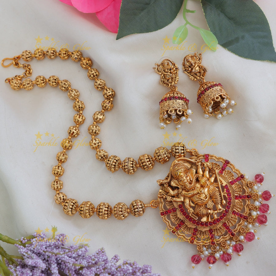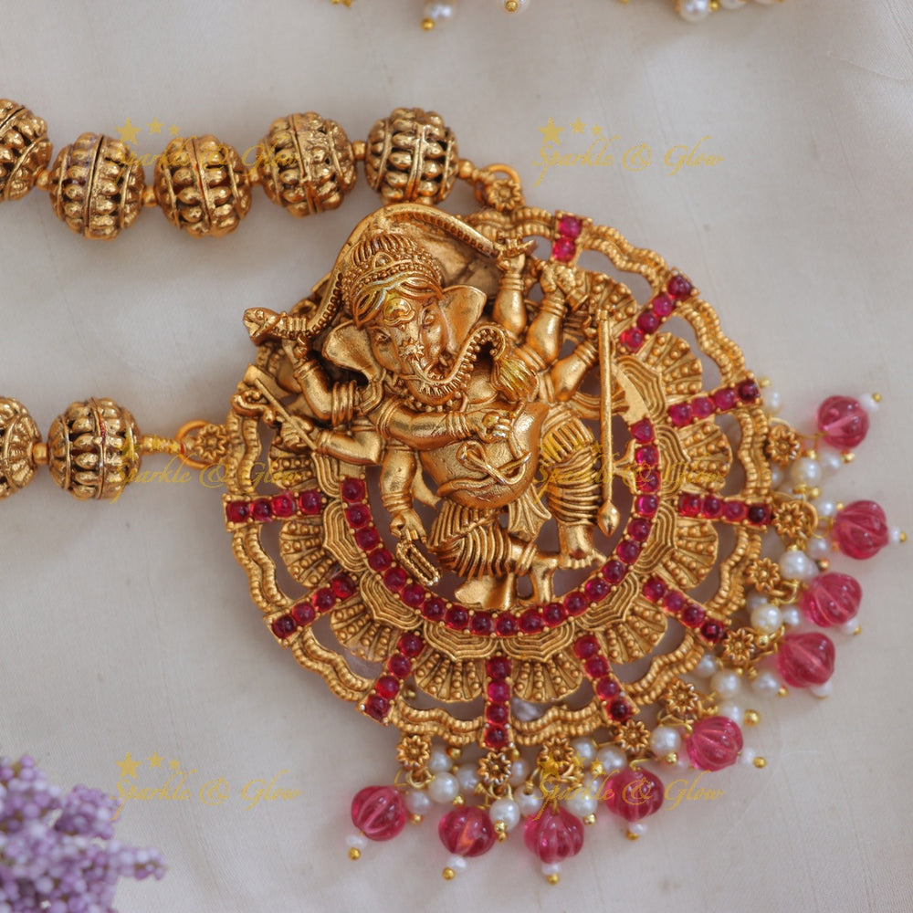Step into the world of divine elegance with our Temple Ganesha Necklace, epitomizing festive gold excellence. Crafted meticulously by skilled artisans, this masterpiece showcases the revered deity Lord Ganesha, symbolizing wisdom and good fortune. Whether you're attending a wedding or a festive celebration, this necklace is designed to elevate your ensemble with its intricate craftsmanship and traditional allure.