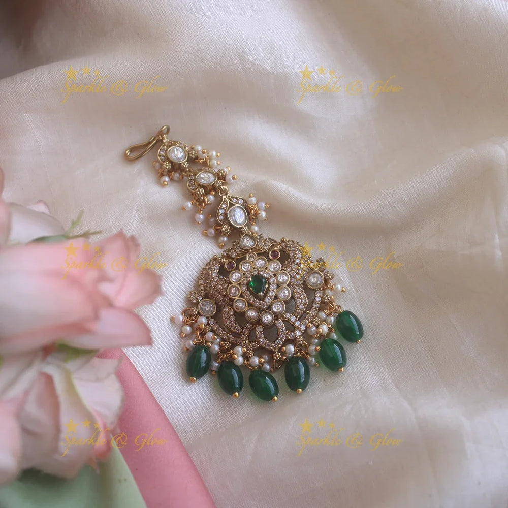 Motifs of peacocks, elephants, and floral designs are intricately carved and embedded with American diamonds, adding a touch of royalty. The colour palette ranges from subtle pastel greens to vibrant rubies and emeralds, set against the gleam of gold finish. Whether it's a choker with a multi-layer pearl chain or a hip-belt adorned with mint green beads, each piece is designed to make you stand out.
