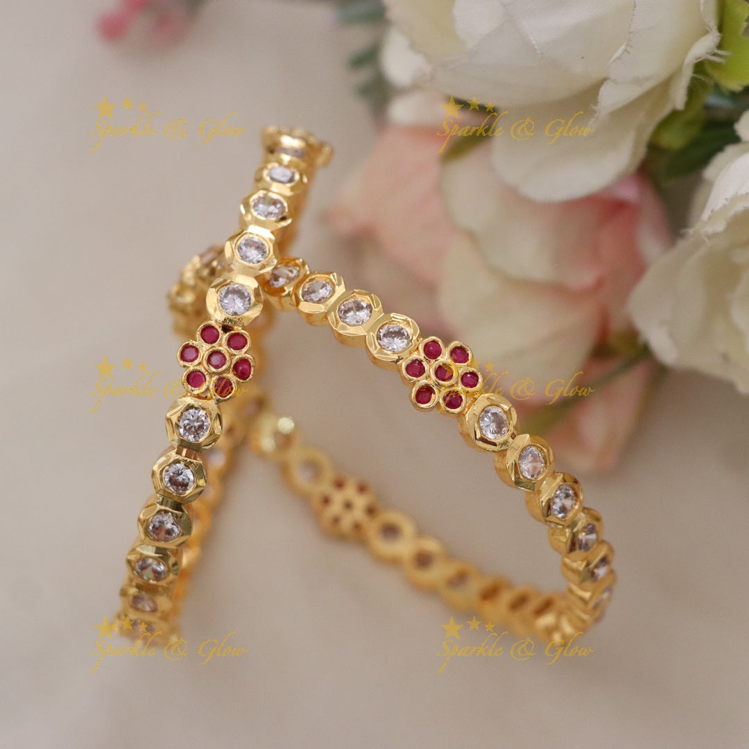 Our Microgold Bangles are not just a piece of jewelry; they are a statement. Each bangle is adorned with delicate floral motifs, complemented by sparkling stones that exude charm and grace. The microgold finish mimics the lavishness of real gold, yet they are lightweight and comfortable to wear throughout the day.