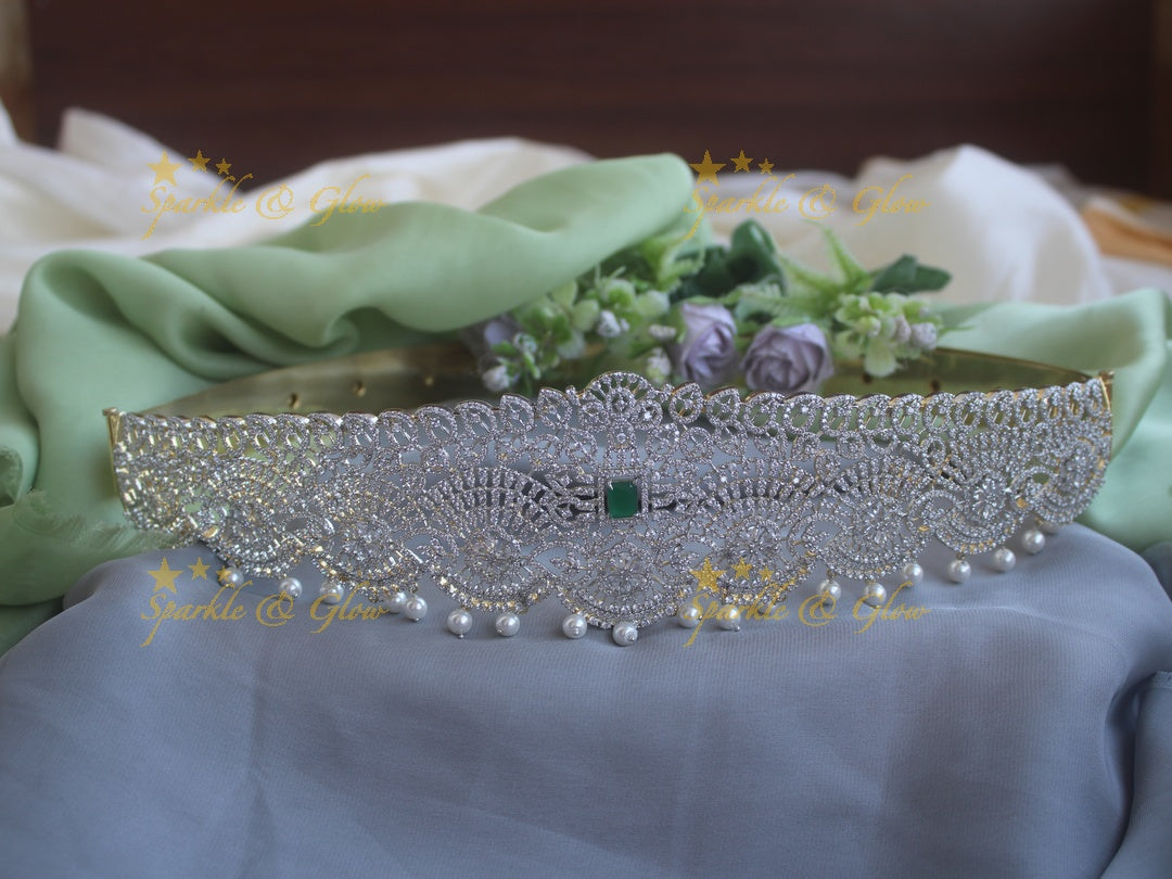 Elevate your festive ensemble with our GJ Polish Leaf Peacock Carved Hipbelt. This exquisite piece showcases intricate peacock motifs, delicately carved in a shimmering gold finish, adorned with sparkling American diamonds. The graceful leaf design adds a touch of nature-inspired elegance, while the lustrous pearls provide a timeless charm.