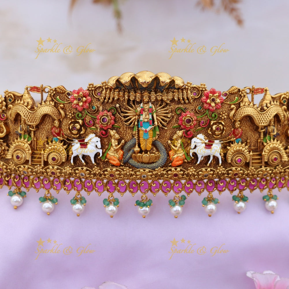 Indulge in the opulence of our new Exquisite Lord Vishnumurthy Hip Belt, and let every occasion become a memorable celebration of tradition and beauty.